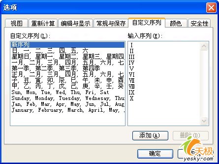 执行“工具→选项”命令,打开“选项”对话框,切换到“自定义序列”标签下,在右侧“输入序列”下面的方框中输入需要定义的序列(每个元素占一行,如图1),输入完成后,单击“添加”按钮,然后确定返回。