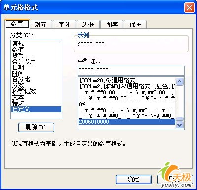 同时选中需要填充这样序号的单元格区域,执行“格式→单元格”命令,打开“单元格格式”对话框(如图2),在“数字”标签下,先在“分类”下面选中“自定义”选项,然后在右侧“类型”下面的方框中输入“2006010000”,按下“确定”按钮返回。