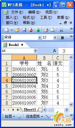 以后,只要将学号后面的序号(如1、2……)输入到相应的单元格中,复杂的学号就自动显示出来了(如图3)。