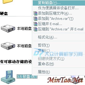 此外,我们还通过如下的方法,将出问题的软盘上的数据,通过“复制磁盘”的操作,如下图,在软驱上点击右键,执行“复制磁盘”。