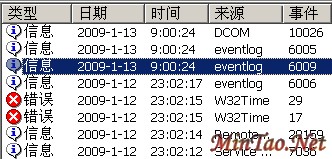 在右侧的“系统事件”列表下,找到6009,6006(eventlog)的项,就可以查看计算机每天的开机和关机时间了,如,俺的计算机,在2009-1-13这一天,是9:00:24开机的;
