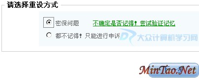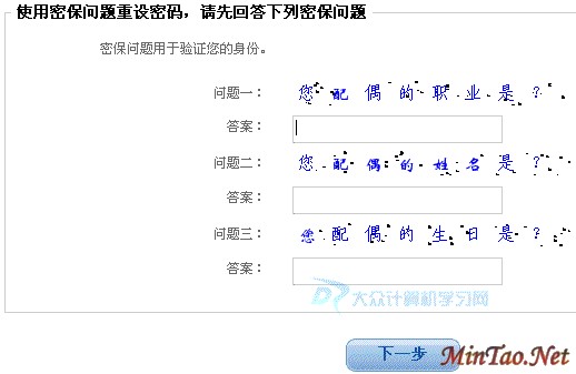 上图中,我们选择“密保问题”或者选择另外一个也行,这得根据需要来选择,之后点击“下一步”按钮!打开如下图的网页!