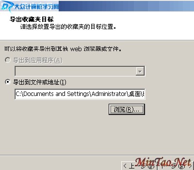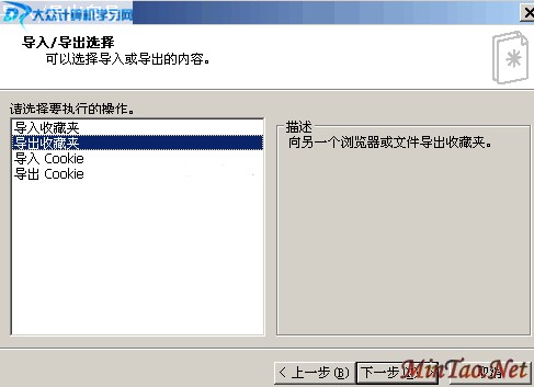 如果只是要保存网址,那么,请选择“导出收藏夹”,点击“下一步”,弹出如下图的对话框!