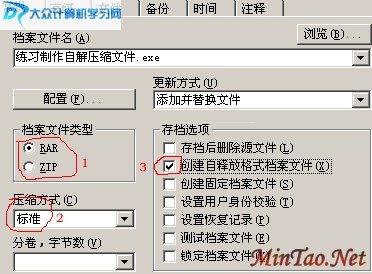 之后在3处的“创建自释放格式档案文件”的前面打上√;这一步是最关键的,不可错!