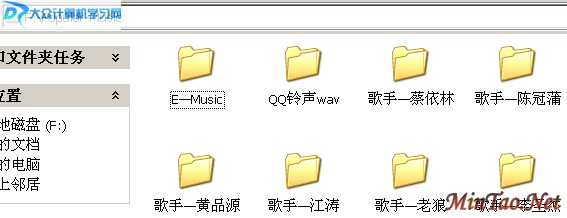 俺的音乐文件,是放到F盘里面的,取个总的文件夹,名称是“Popular-Music”,流行音乐哦!之后,在其内部建立多个文件夹,分别存放不同歌星或歌手的音乐!