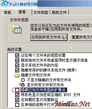 弹出下图的对话框,我们先选择“查看”选项卡,之后在“高级设置”列表里面拖动滚动条,找到“隐藏已知文件类型的扩展名”,将其前面的勾取消即可!