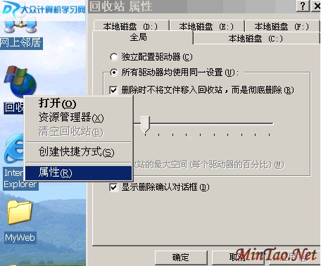 一般情况下,回收站可以在计算机桌面上找到其对应的图标,要对它进行操作,首先选择回收站图标,点右键,找到“属性”命令左键点一下,即可弹出“回收站 属性”对话框,相关的设置即可在这里进行操作,如下图: