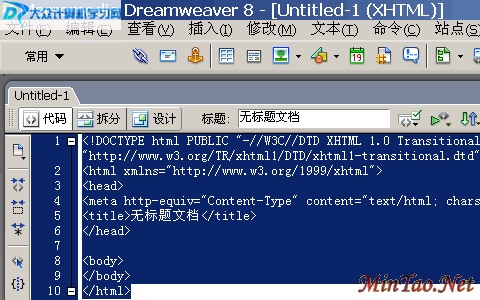 在打开网页制作软件的同时,会新建一个页面,将网页模式切换到“代码”方式,之后全部选择里面默认出现的HTML代码并将其删除;