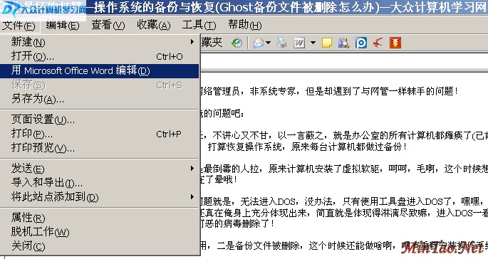 另:如果你的计算机安装了FrontPage软件,那么,上图中的“用Microsoft Office Word编辑”会被为”→“用Microsoft Office FrontPage编辑”;操作方法雷同。 ②:这招是绝招,放之四海皆准 首先保证你的计算机安装了网页制作软件,要么是如下图的网页制作软件,要么是FrontPage,两者都可实现! 实现方法: 在你查看资料的网页窗口中,执行IE浏览器或其他浏览器的菜单: