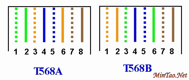 RJ-45各脚功能(10BaseT/100BaseTX):如上图! 1、传输数据正极 Tx+ 2、传输数据负极 Tx- 3、接收数据正极 Rx+ 4、未使用 5、未使用 6、接受数据负极 Rx- 7、未使用 8、未使用 上图中,T568A是标准的A类水晶头接法,T568B是标准的B类水晶头的接法!