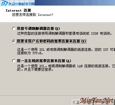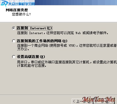 上图中,选择“连接到Internet”,点下一步,弹出如下图的对话框!