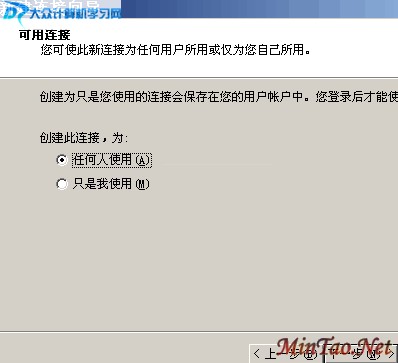 上图中,如果想让使用您的计算机的所有用户名都能使用此连接,就选择“任何人使用”,否则选择”只是我使用”,点下一步,弹出如下图的对话框!