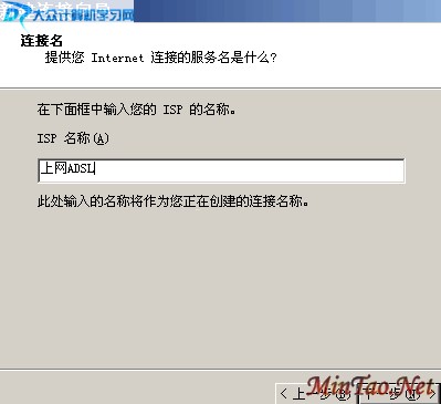 上图中,给宽带连接取一个名字,如本文的“上网ADSL”,点下一步,弹出如下图的对话框!