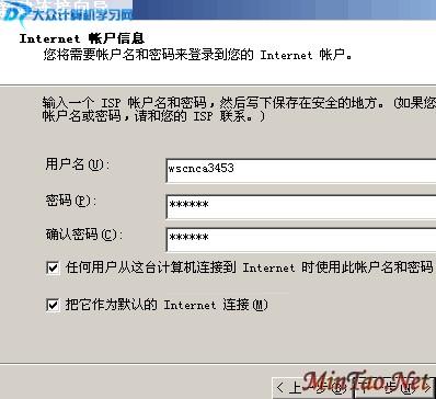 上图中,输入ISP商给您提供的用户名和密码,这个只有您知道哦,之后点下一步,弹出如下图的对话框!