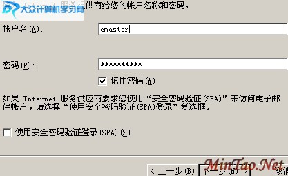 再点击“下一步”; 6、输入你的帐号及密码(此帐号为登录此邮箱时用的帐号,仅输入@ 前面的部分),再点击“下一步”;