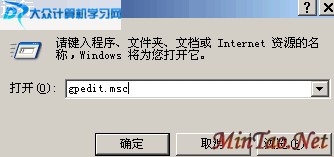 ①:执行操作:“开始”→“运行”;弹出如下的运行对话框,在输入框中输入gpedit.msc;之后点确定!