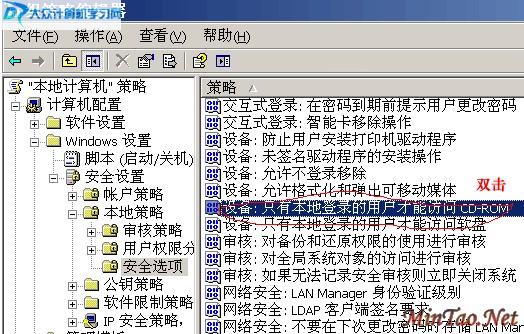 打开"计算机配置--WINDOWS设置--安全设置--本地策略--安全选项",在右边的设备中找到“只有本地登陆的用户才能访问CD-ROM”;如下图所示;