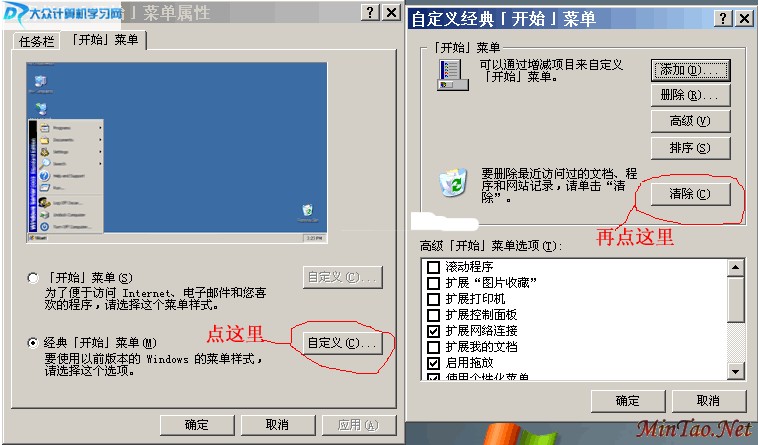 在“开始”菜单上点右键,找到“属性”;打开如下对话框,按提示进行操作就行!
