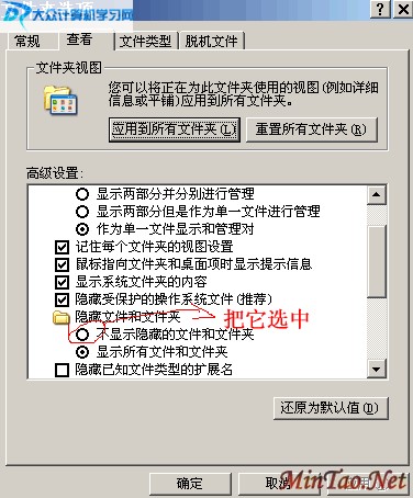 在窗口中选择“查看”选项卡,之后拖动垂直滚动条滚动,一直找到“显示所有文件和文件夹”,把它前面的单选钮选中即可,按“确定”退出,再刷新窗口,这样就可以看到具有隐藏属性的文件和文件夹了!
