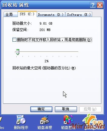 由于长期积累了很多废弃的文件没有删除,一个一个丢到回收站然后清除觉得很麻烦,每次使用shift+del删除也不方便,于是想到回收站好像也有属性设置的,于是打开。(如图二)