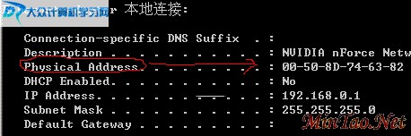 1、在windows 9x/2000/XP/2003操作系统下单击"开始/程序",找到"MS-DOS方式"或"命令提示符"。 2、在命令提示符下输入:"Ipconfig /all",回车后出现如下图所示的对话框,其中的"Physical Address"即是所查的MAC地址。