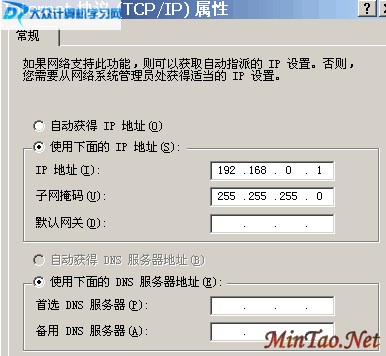 其它机器进行类似设置设置,在“IP地址”中的“指定IP地址”,将其IP地址设为除192.168.0.1之外的任一尾数在1-255之间的地址,例如192.168.0.2或192.168.0.3……,总之其尾数要保证与局域网的主机和其它电脑的该地址不同。子网掩码同样为255.255.255.0。