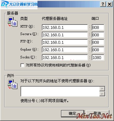 选中“高级”,在“服务器类型”中分别填入:HTTP为192.168.0.1,端口为808;FTP为192.168.0.1,端口为2121;Socks为192.168.0.1,端口为1080等;然后单击“确定”完成对IE的设置。至此,客户端设置大功告成,只要主机能上网从机也就可以共享上网了。 [搜索优化]闵涛——如何让百度重新收录你的网站,网站被K怎么… [电脑应用]教你如何远程管理MSSQL数据库 [Web开发]教你如何在PHP开启gzip页面压缩实例介绍 [办公软件]在Powerpoint中如何插入Flash动画 [办公软件]如何在Powerpoint 中(实现)输入上标、下标 [办公软件]如何实现Office工具栏、菜单以及菜单命令重命名 [办公软件]如何在PowerPoint同一张幻灯片中显示大量文字 [办公软件]如何在Office文档(大)括号内输入多行文字 [办公软件]如何在office(PowerPoint,Word,Excel)中制作带圈的… [办公软件]如何删除PowerPoint幻灯片中的页脚信息