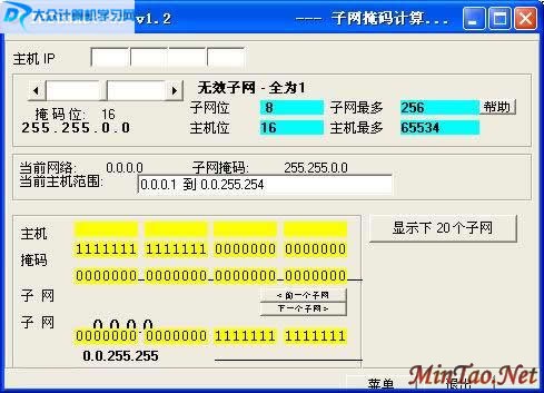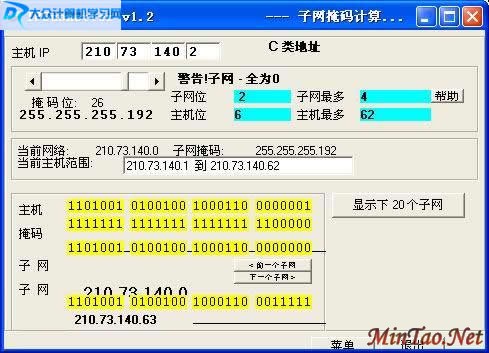 接着运行Wildcard工具的安装程序,打开对应的程序界面,再单击其中的“子网掩码计算器”按钮,进入到子网掩码设置页面;然后将上面查找得到的IP地址,直接填写在“主机IP”文本框中,随后Wildcard工具就会在“主机IP”文本框右侧,自动弹出当前网络的规模。例如,要是输入“210.73.140.2”地址的话,Wildcard工具就会自动告诉你当前网络属于C类地址网络,该网络至多只能包含254台工作站.
