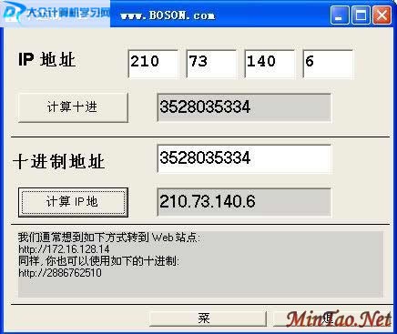 接着单击“计算十进”按钮,就能知道十进制IP地址为“3528035334”,以后你也可以通过“http://3528035334”或“ftp://3528035334”形式来访问“210.73.140.6”服务器了。当然,在“十进制IP计算器”设置窗口中,你也可以将十进制IP地址快速转换成普通的IP地址。
