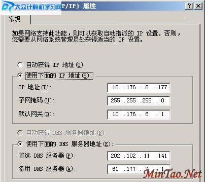 再用鼠标右键单击该窗口中的“本地连接”图标,从弹出的快捷菜单中选择“属性”命令,打开本地连接属性设置窗口;单击该窗口中的“常规”标签,并在对应标签页面中将“Internet协议(TCP/IP)”项目选中,再单击该项目下面的“属性”按钮,进入到如下图所示的TCP/IP属性设置界面。