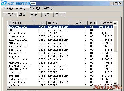 在这里我们可以清楚地看到系统每一个进程占用的CPU资源,一旦某个进程对应的CPU占用率超过90%以上时,那多半是该进程感染了网络病毒,此时我们必须及时选中该进程,并执行“结束进程”命令。