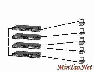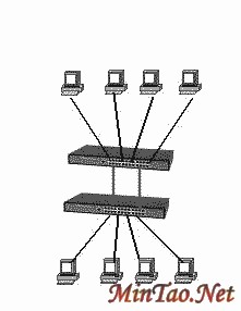 堆叠方式(图3)是通过在交换机的扩展槽上插入堆叠模块,使用专用的堆叠链路在交换机之间交换数据。堆叠后的交换机组可被看作为一台交换机,它具有更好的交换能力和更高的端口密度。需要注意的是不同厂商生产的交换机是不能堆叠在一起的。