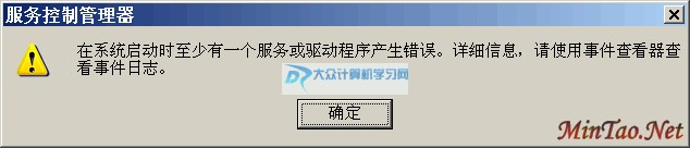 在计算机启动之时,相应的系统服务没有正常启动导致的提示,一般,提示内容为“在系统启动时至少一个服务或驱动程序产生错误.详细信息,请使用事件查看器查事件日志”; 如下图