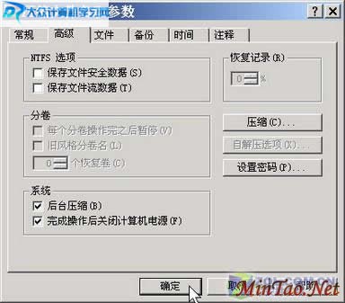 方案九:下班后备份、完成后关机 通过“计划任务”和WinRAR,我们也可以实现下班后备份数据,备份后关机的目的:在制作配置文件时,单击“高级”标签,然后选中“后台压缩”和“完成操作后关闭计算机电源”复选框(如图7)。再在图6窗口中设置开始备份操作时间为下班时间,如18:00,这样备份完数据后,机器会自动关闭。