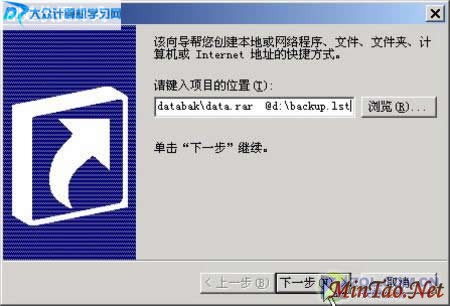 小提示 ★如果我们想备份多个文件夹下的数据,可以多建立配置文件,并把它们添加到“任务计划”窗口中。 ★备份完成时,最好自动锁定机器:先在桌面上新建一个名为“自动锁定”的快捷方式,其中的命令为rundll32.exe user32.dll,LockWorkStation。接着把这个快捷方式拖到“任务计划”窗口。然后双击该图标,单击“日程安排”标签,单击“任务计划”下拉列表框,从中选择“空闲时”,在“当计算机空闲时间超过xx分钟”处将时间改为1分钟。再单击“设置”选项卡,取消所有选项的勾选。完成以上设置后,按“确定”按钮,再在打开的窗口中输入系统管理员密码,退出设置窗口。这样,当我们离开机器,一分钟后没有操作,则机器会自动被锁定。这样,在备份数据时,会安全很多。可以防止同事在你机器上随意操作。 方案十:备份多个文件、文件夹 如果你的文件放在多个文件夹下,并且想备份这多个文件夹中的内容,可以这样来操作: 先在D:\上建立一个备份列表文件,如back.lst,在其中你欲备份的文件或文件夹,如: D:\Work1\*.* D:\Work2\*.* \\data\work\*.* \\server\docs\*.* …… 接下来,可以右击桌面,选择“新建”→“快捷方式”命令,在其中输入C:\Program Files\WinRAR\WinRAR.exe a -ep2 -ibck \\data\databak\data.rar @d:\backup.lst,即最后的命令行应为: "C:\Program Files\WinRAR\WinRAR.exe" a -ep2 -ibck \\data\databak\data.rar @d:\back.lst(如图) 再为这个快捷方式命名为“建立备份文件”。双击该快捷方式,WinRAR即可在后台自动读取back.lst文件中要备份的文件或文件夹,并把它们备份到\\data\databak\data.rar 文件中了。 接下来,同样把该快捷方式放到“计划任务”中,然后为其指定运行时间。就可以定时备份多个文件或文件夹中的内容了。