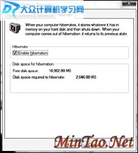 如果你并不需要进入休眠方式,那么可以干脆从开始菜单中取消这一功能,右击任意空白处,选择“Personalize Computer”打开“Personalize appearance and sound effects”窗口,切换到“Screen Saver”窗口,单击“power”按钮进入“Power Optios Properties→Hibernate”页面,如图2所示,将“Enable hibernation”复选框取消就可以了。