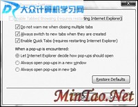 我们知道,Windows Vista中的IE支持标签浏览,但默认设置下并不会自动激活这一功能,也就是说单击网页中的链接后,仍然会重新打开一个IE窗口,这样就很不方便了。请打开“Internet Options→General”窗口,这里有一个名为“Tabs”的区域,单击“Settings”按钮,打开图1所示对话框,我们可以在这里设置是否需要启用或禁用标签功能,很显然,只要勾选“Enable Tabbed Browwsing”复选框即可,但需要重新启动IE才能生效。