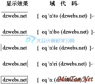 上图,在域名代码那里输入框中,输入eq \x\bo (dzwebs.net),按上图的示例,注意空格的地方一定要空出来,Eq是域名名称,\x\bo是参数,(dzwebs.net)是要显示带有相关划线的文字,小括号可不能少滴;