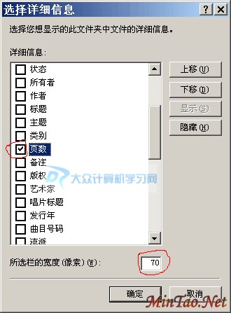 上图中,在“详细信息”列表中找到“页数”,在其前面打上一个√;之后,我们还能在对话框下面看到“所选栏的宽度(像素)(W):”,后面就是宽度的值,这里指的是,显示“页数”栏的宽度,默认是70个像素,可以不修改,也可以自行修改!
