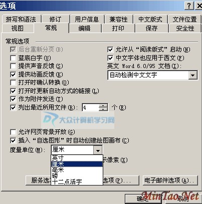 之后,会打开如下图的对话框,选择“常规”选项卡,界面下方有一个“度量单位”下拉组合框;