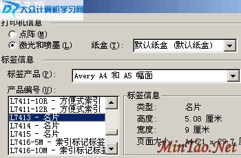 弹出如下图的对话框,根据图示,“标签产品”选择Avery A4 和 A5 幅面;“产品编号”选择L7413 - 名片;然后点击“确定”按钮确认;