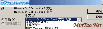 弹出如下图的对话框,在这里选择“Microsoft Office Word 文档 对象”,然后点击“确定”按钮;
