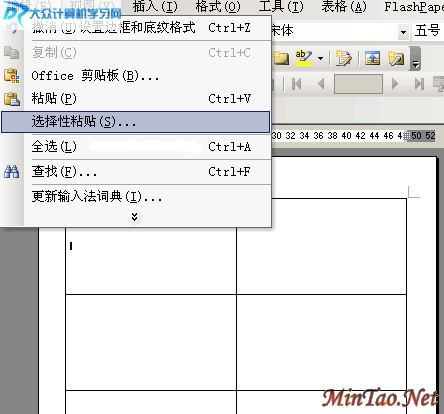 如果您的文档没有显示出表格线框,可选择整个表格,设置其线条,以方便查看十个单元格;至于为什么要设置成为这种尺寸的页面及十个单元格,目的是为了精确的将上一例的名片完全吻合的粘贴到十个格子里面,省得调整名片大小而浪费不必要的时间! 这个时候,打开上一例我们介绍的单张名片制作的Word文档,执行操作:“编辑”→“全选”;这个时候,系统就会完全选中单张名片对象;之后我们再执行操作“编辑”→“复制”; 注意,上面的这一步操作极为重要,不可错洛! 然后,切换到如上图一样,有十个单元格的窗口,选择第一个单元格,执行如下图的操作:“编辑”→“选择性粘贴”;