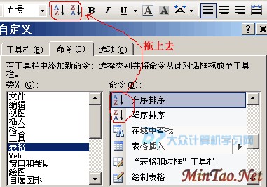 之后,切换到“命令”选项卡,在“类别”列表里面找到“表格”,之后在右边的“命令”列表里面找到“表格”对应的命令,即“升序排序”和“降序排序”,将这两个按钮拖到工具栏中即可!