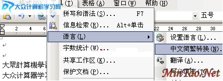②:在“工具”菜单上,指向“语言”,再单击“中文简繁转换”;