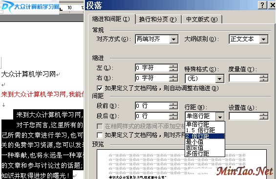 弹出段落对话框,在“行距”下面的下拉组合框中进行选择,可以选择单倍行距或2倍行距,或者更多的选择;