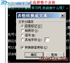 ②:之后执行“表格”→“转换”→“表格转换为文本”;弹出如上图的对话框,在这里可以二话不讲,直接点击“确定”按钮即可完成操作!!!