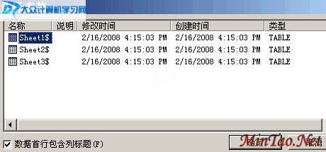 选择好EXCEL文件以后,还需要选择EXCEL文件的工作表,在这里,我们选择第一张工作表,即"Sheet1$",之后点击确定即可!