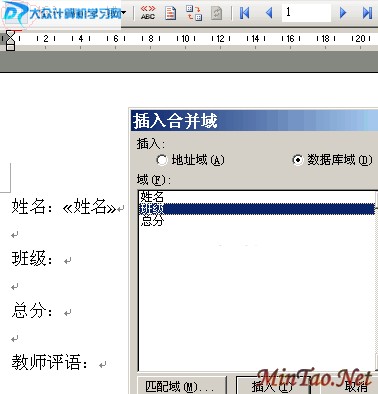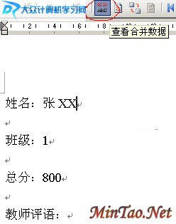 插入域之后,这个时候,你是无法看到相应数据的,你只能看到如上图中的<<姓名>>这样的文字,而看不到具体的姓名!