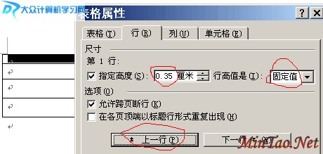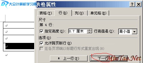 那么我们如何才能知道下面两行的高度呢,不急,如下图所示,直接点击“下一行”按钮,当下面两行中的任何一行被选中时,我们即可发现他们的高度了,其高度是0.7 厘米!